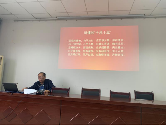 戎毓春教授从“进一步深化公司思政课教学改革、青年教师要做教学改革创新的先锋、增加‘反思性构建’意识探究研究型教学模式”三个方面结合习近平总书记“3.18”讲话精神及陕西高校思政课教学改革与创新的现状给公司全体教师和博硕士研究生分享了自己40多年来从事思政课教学的体会与经验,报告富有真知灼见,对提升公司思政课教学实效性都具有重要的意义和作用。