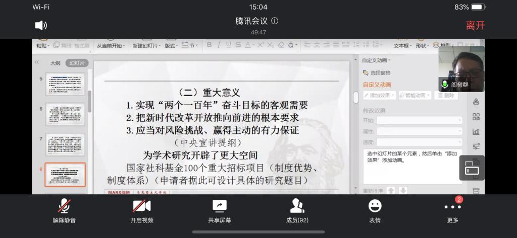 阎老师主要从五个方面帮助参会师生理解十九届四中全会精神:全会的历史地位和重大意义;《决定》的基本框架;中国特色社会主义制度和国家治理体系的显著优势;中国特色社会主义制度“图谱”;中国特色社会主义制度的理论创新。阎老师全面系统地为参会人员解读十九届四中全会精神,并对中国特色社会主义制度脉络进行详细梳理,讲清讲透了党对坚持和完善中国特色社会主义制度的现实意义和理论意义;阎老师也指出要充分和深刻的认识到习近平新时代中国特色社会主义思想是对马克思列宁主义、毛泽东思想、邓小平理论、“三个代表”重要思想、科学发展观的继承和发展,是马克思主义中国化最新成果,是党和人民实践经验和集体智慧的结晶,是中国特色社会主义理论体系的重要组成部分,是全党全国人民为实现中华民族伟大复兴而奋斗的行动指南。