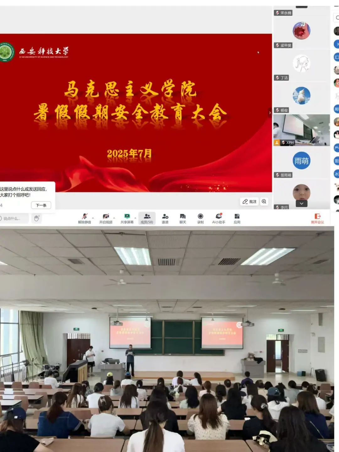 为进一步筑牢校园安全防线,提升师生安全意识和自我防护能力,确保暑期校园及师生人身财产安全,伟德bv1946官网于7月1日下午在煤炭楼301教室召开2025年暑期安全主题教育大会。公司党委副书记韩帅,学工办主任、团委书记李超出席本次会议。本次会议采取线上线下相结合方式,公司全体2024级硕士研究生线下参会,2023级硕士研究生及全体在校博士研究生线上参会。