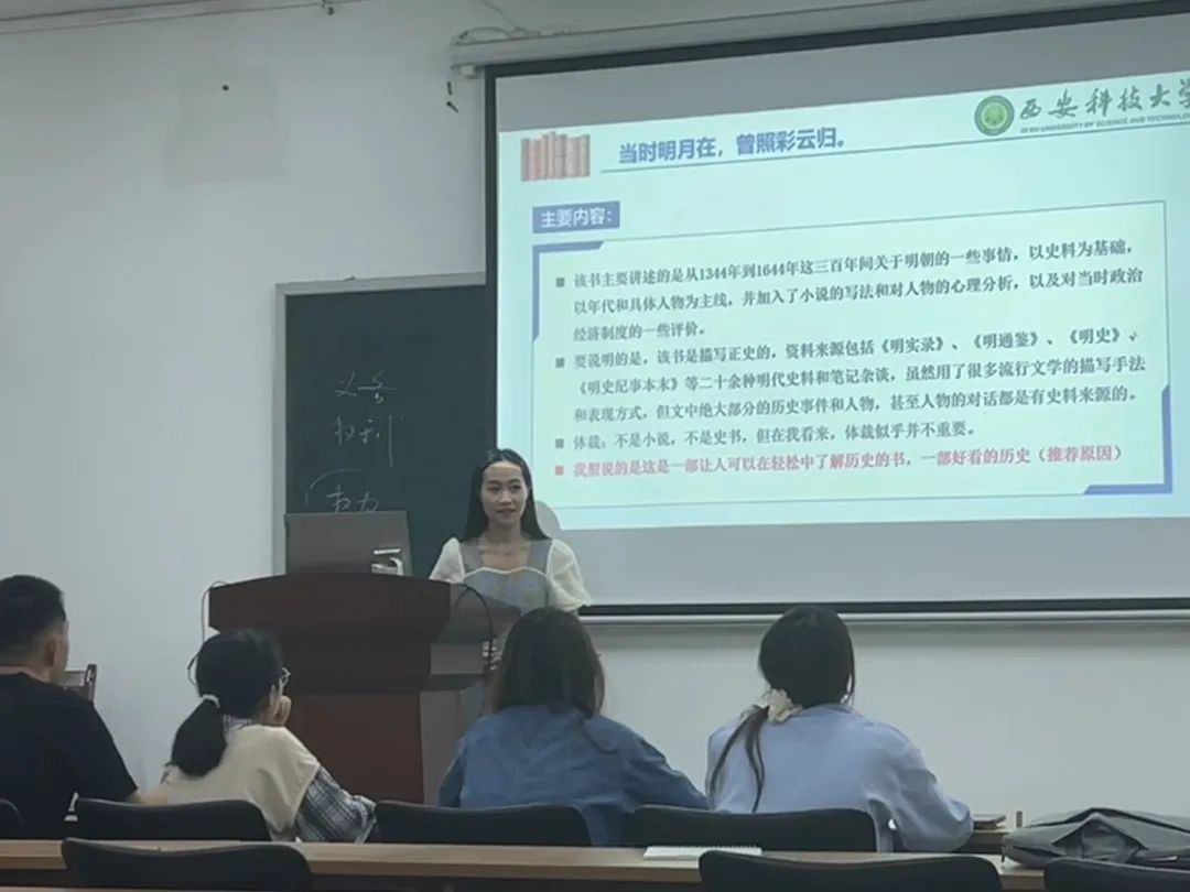 田楚涵分享的是《明朝那些事儿》,她从这本书的主要内容、体裁等方面进行分享,认为这本书是一部可以让人们轻松了解历史的书。