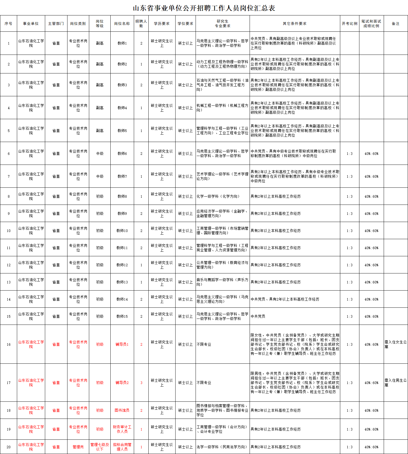 3.应聘辅导员岗位人员年龄应在35周岁以下(1987年10月30日以后出生);其他岗位:应聘初级岗位的人员年龄应在40周岁以下(1982年10月30日以后出生),应聘中级岗位的人员年龄应在45周岁以下(1977年10月30日以后出生),应聘高级岗位的人员年龄应在50周岁以下(1972年10月30日以后出生)。